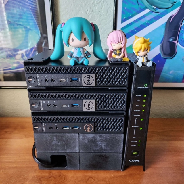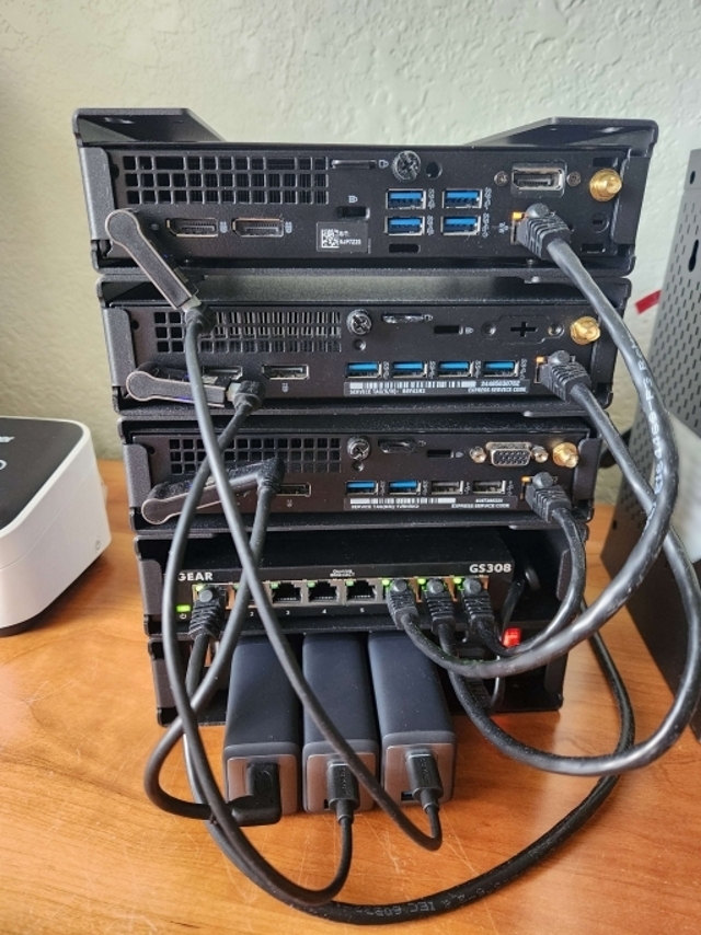 There are three Dell Optiplex Micros all linked together with a basic Netgear switch.