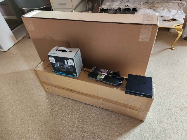 | Most of the parts here were sourced from my local Microcenter. That includes the 43" LG TV, the InLand Heavy-Duty cart, and the Edifier G2000 speakers. The hard mat itself is an L-TEK EX Pro X w/ the handbar. Personally I'm not a fan of their handbar, it's not as sturdy as I would like it. |